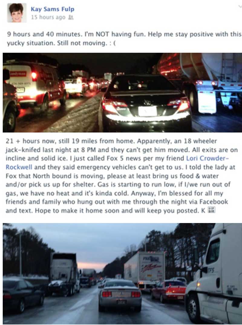 “21+ hours now, still 19 miles from home. Apparently, an 18 wheeler jack-knifed last night at 8 p.m. and they can’t get him moved. All exits are on incline and solid ice. I just called Fox 5 per my friend Lori Crowder-Rockwell and they said emergency vehicles can’t get to us. I told the lady at Fox that North bound is moving, please at least bring us food and water and/or pick us up for shelter. Gas is starting to run low, if I/we run out of gas, we have no heat and it’s kinda cold. Anyway, I’m blessed for all my friends and family who hung out with me through the night via Facebook and text. Hope to make it home soon and will keep you posted. K”